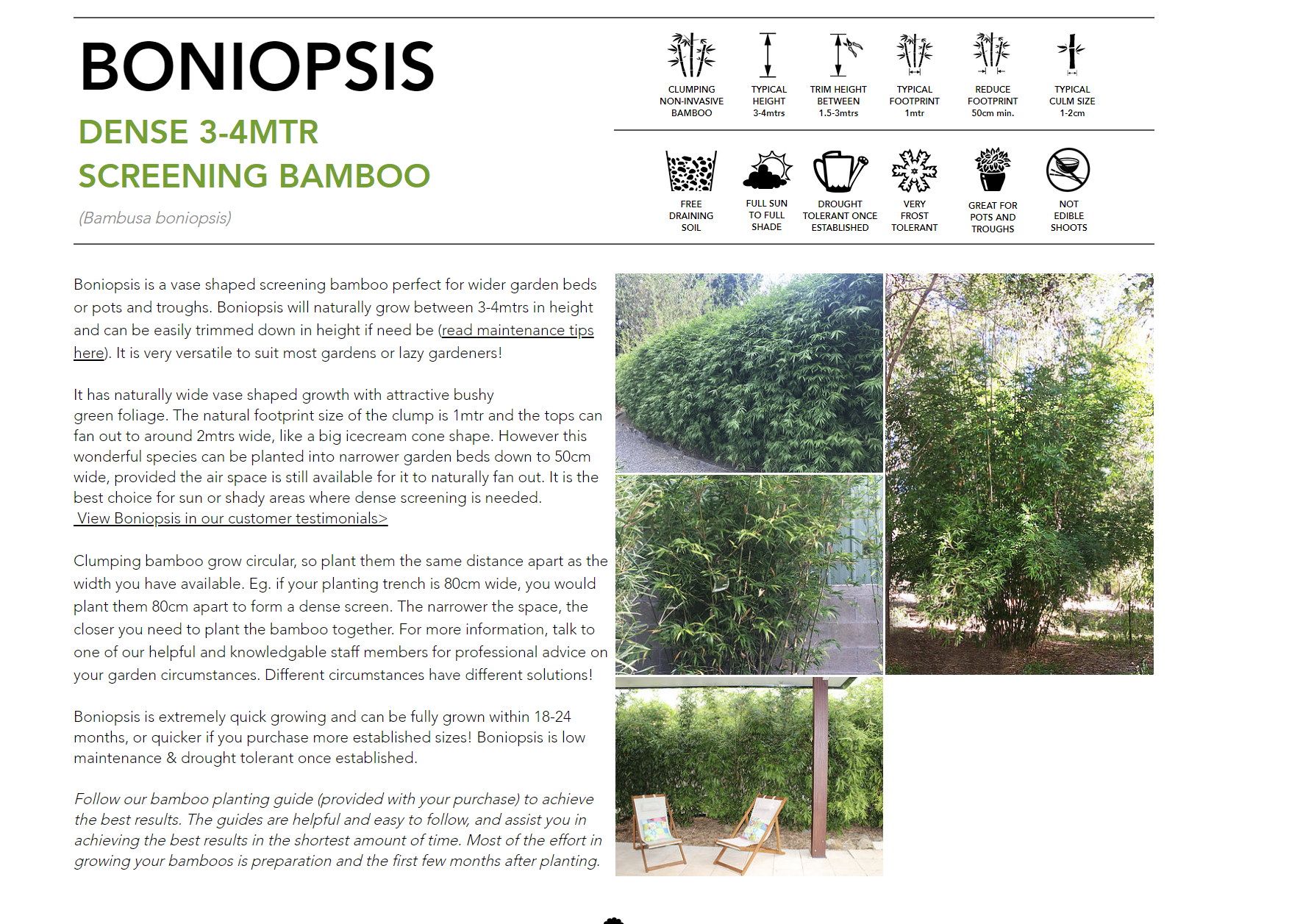 Boniopsis is a vase shaped screening bamboo perfect for wider garden beds or pots and troughs. Boniopsis will naturally grow between 3-4mtrs in height and can be easily trimmed down in height if need be . It is very versatile to suit most gardens or lazy gardeners!