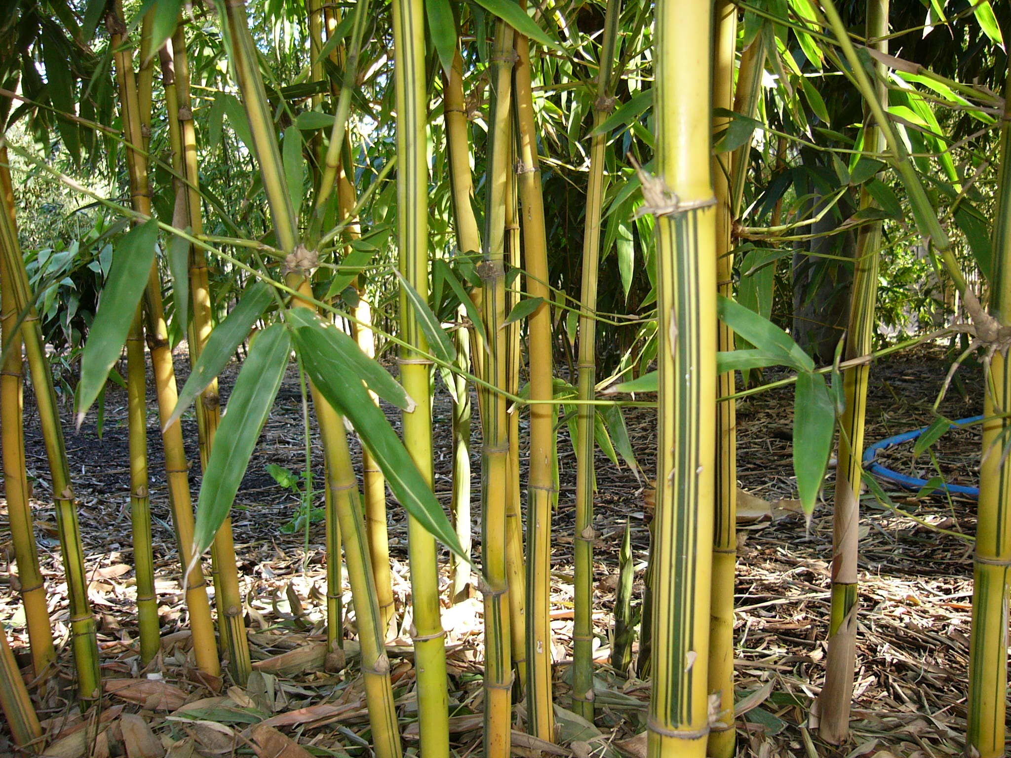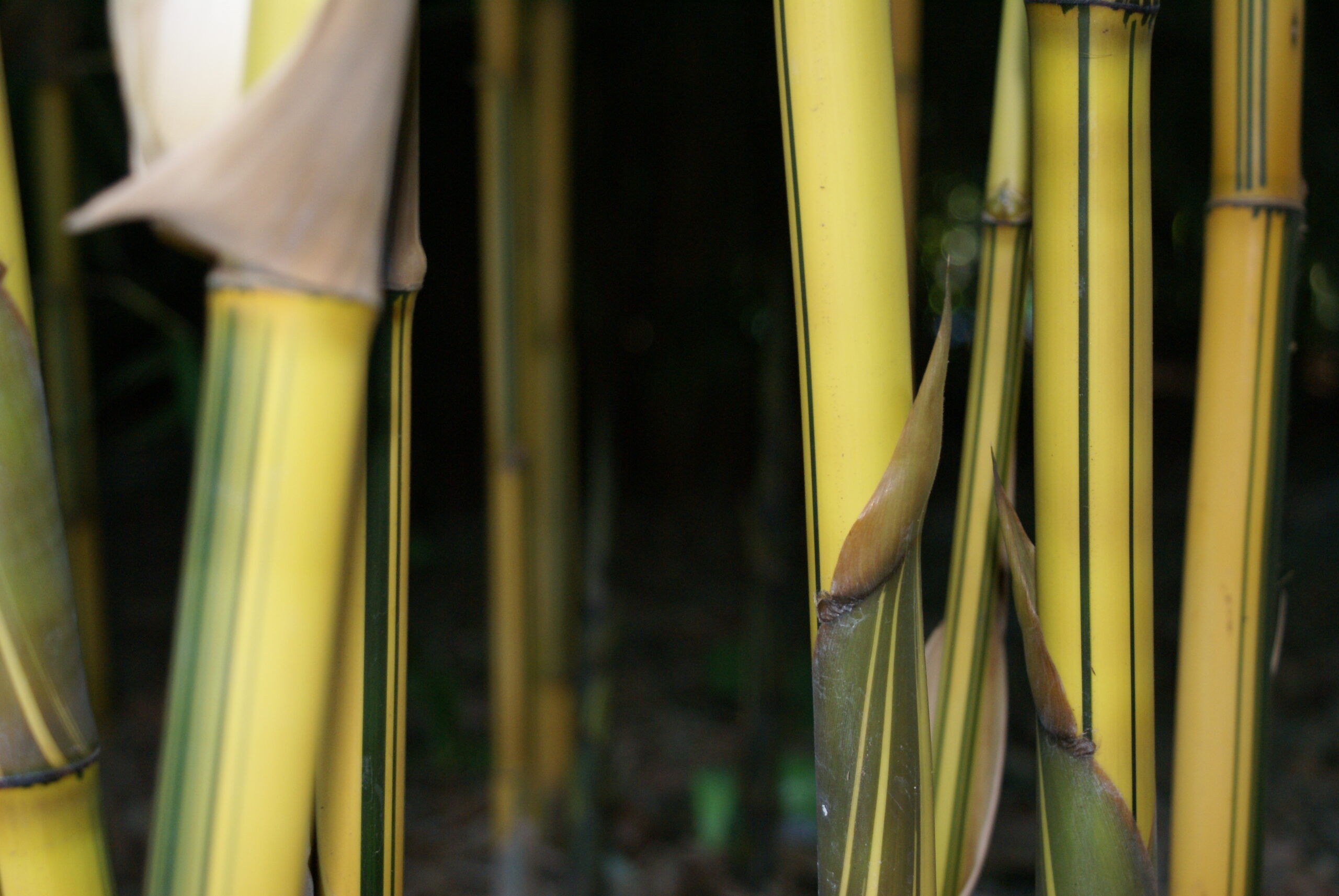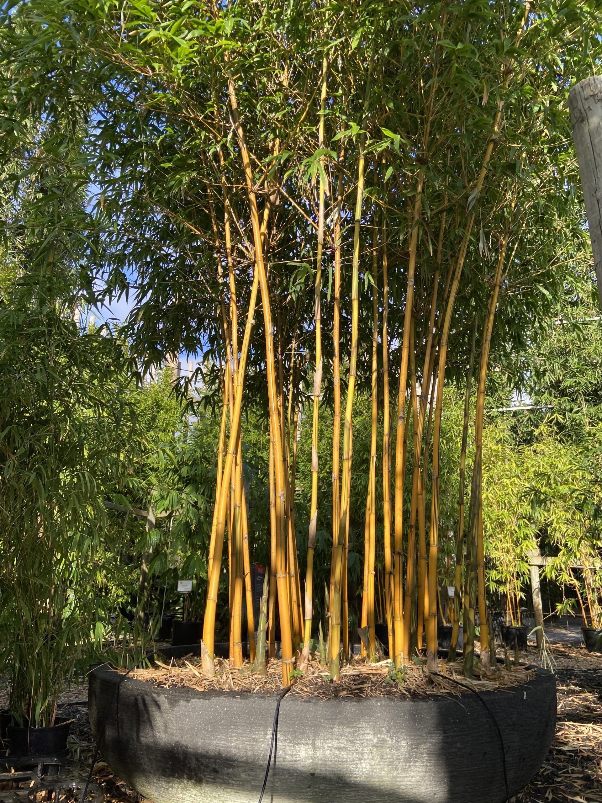 China Gold is a large ornamental bamboo featuring green and gold striped culms and bushy dark green foliage. China Gold will naturally grow up to 6-8 metres in height and can be easily trimmed down in height if need be (read maintenance tips here). This is one of the only ‘large’ bamboo species that can be maintained into very narrow garden beds or pots & troughs!