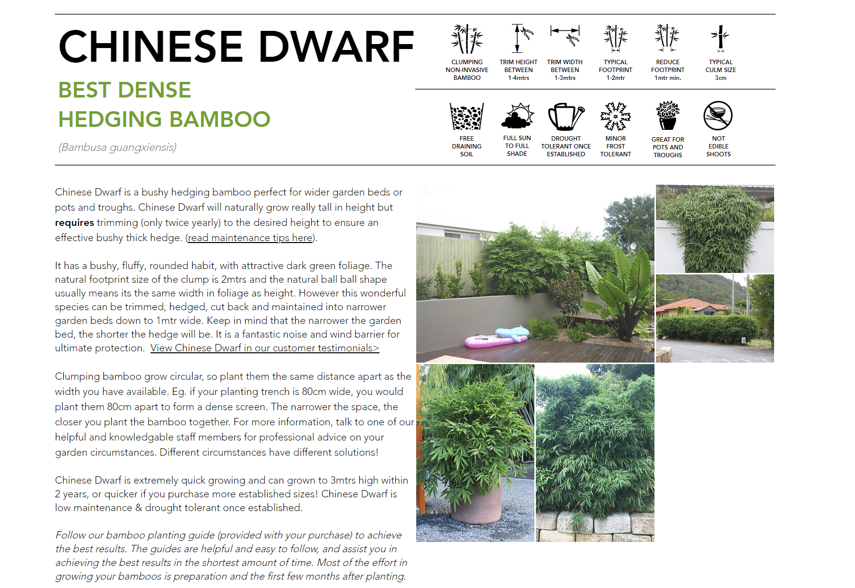 Chinese Dwarf is a bushy hedging bamboo perfect for wider garden beds or pots and troughs. Chinese Dwarf will naturally grow really tall in height but requires trimming (only twice yearly) to the desired height to ensure an effective bushy thick hedge.