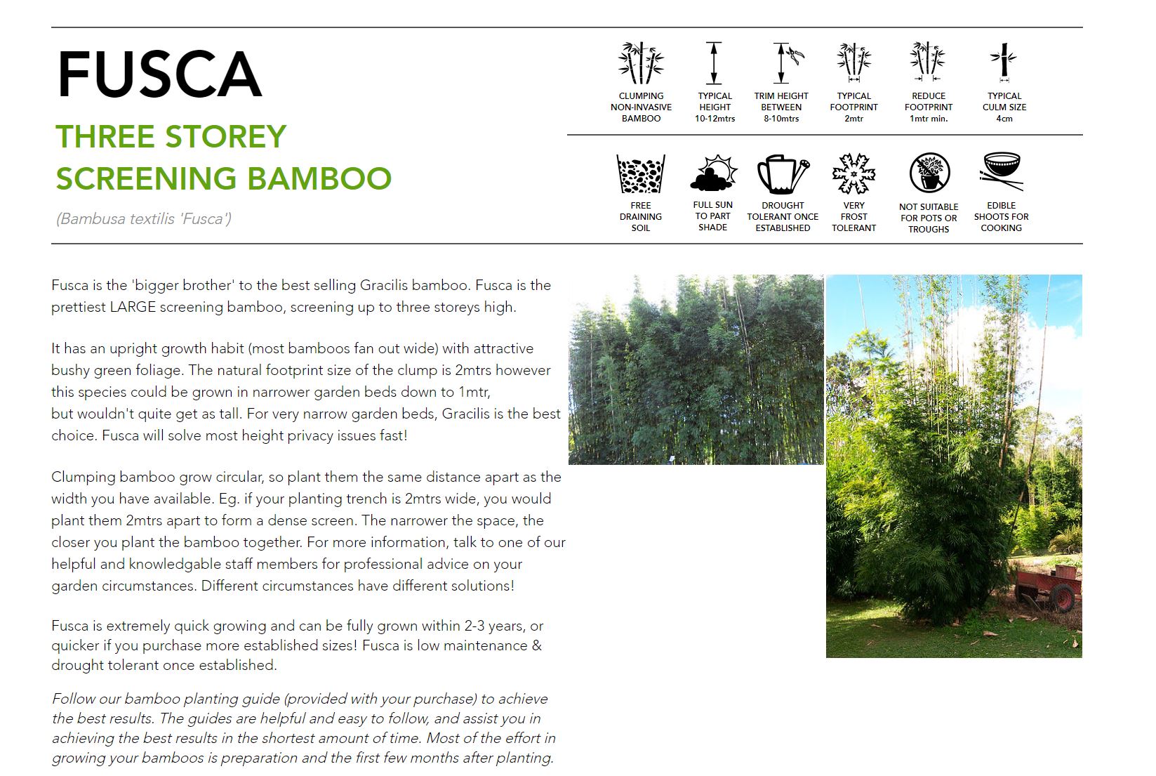 Fusca is the ‘bigger brother’ to the best selling Gracilis bamboo. Fusca is the prettiest LARGE screening bamboo, screening up to three storeys high.
