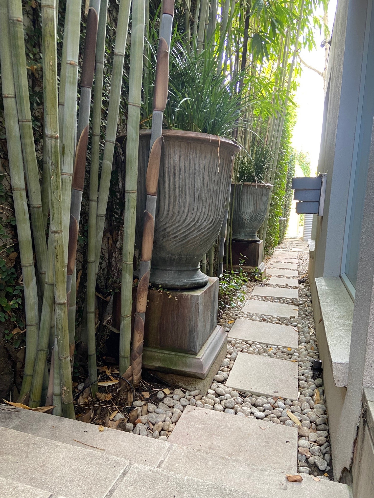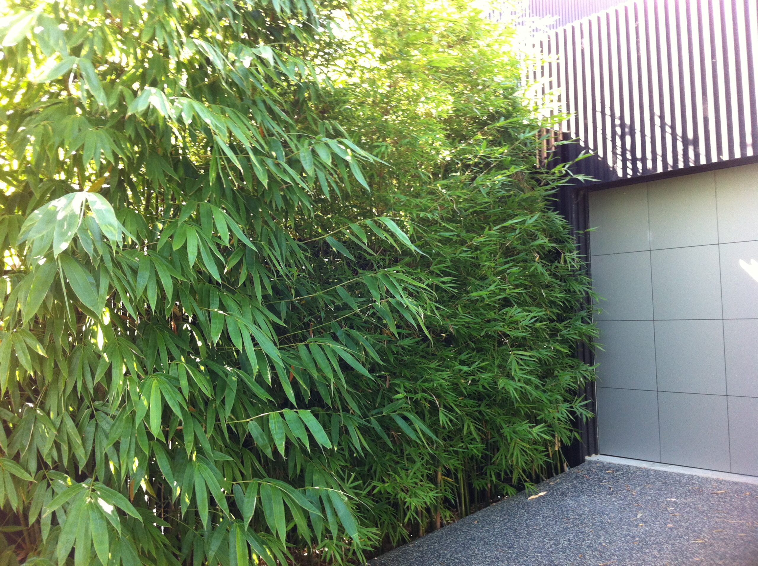 Clumping bamboo grow circular, so plant them the same distance apart as the width you have available. Eg. if your planting trench is 1.2mtrs wide, you would plant them 1.2mtrs apart to form a dense screen. The narrower the space, the closer you plant the bamboo together. For more information, talk to one of our helpful and knowledgable staff members for professional advice on your garden circumstances. Different circumstances have different solutions!